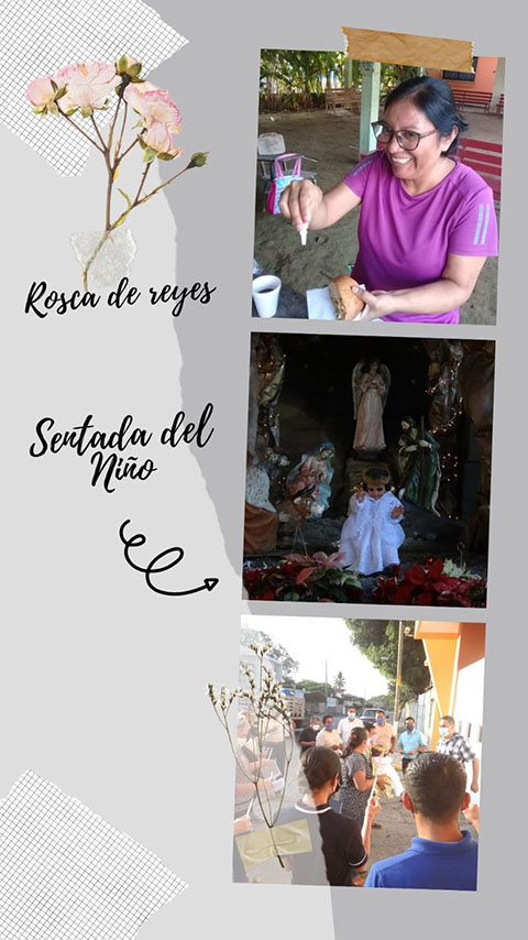Es tradición de esta zona del país sureste-costa (Tapachula), simular, al modo en que lo hizo la Sagrada Familia, una petición de posada. El acto consiste en ir de casa en casa hasta llegar a la posada dónde nos reciben y se comparte tamales y atole o café. También forma parte de esta tradicional la Partida de Rosca de Reyes, que se hace el 6 de enero o días cercanos. Se reparte la rosca (pan) en cuyo interior contiene pequeños niños y a quien le sale en su parte del pan, el 2 de febrero, comparten tamales para todos. Son tradiciones de esta época hasta el día 2 de febrero. Los grupos con los que compartimos en el colegio, grupo de mujeres de la comunidad de la lima, grupo de mujeres Naïm y la capilla de San Pedro Chanel.