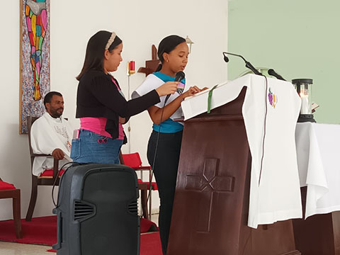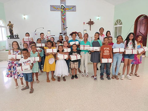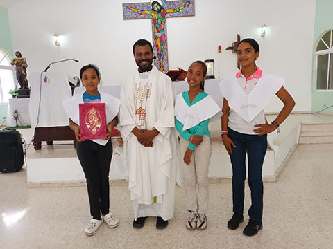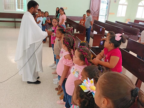 Chiqui pascua con los niños de la catequesis en la parroquia San Isidro Labrador de Estebanía el Jueves Santo, la eucaristía fue presidida por el padre Bernardo Peralta. Después entregamos unos regalos que vinieron desde Estados Unidos.